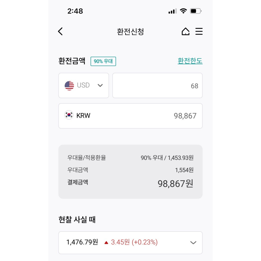 먼저 외환은행에서 환전 환율을 계산해 보았다. 90%우대라고 된 것은 앞에서 말한 환율 차이에서 90%를 빼준다는 의미이다. 약간의 시차가 있을 수는 있겠지만 거의 동시에 환율을 기록해 두어서 거의 같다고 보면 되는데 외환은행 90% 우대 환율 적용 시 달러 매수 환율은 1453.93원이었다.